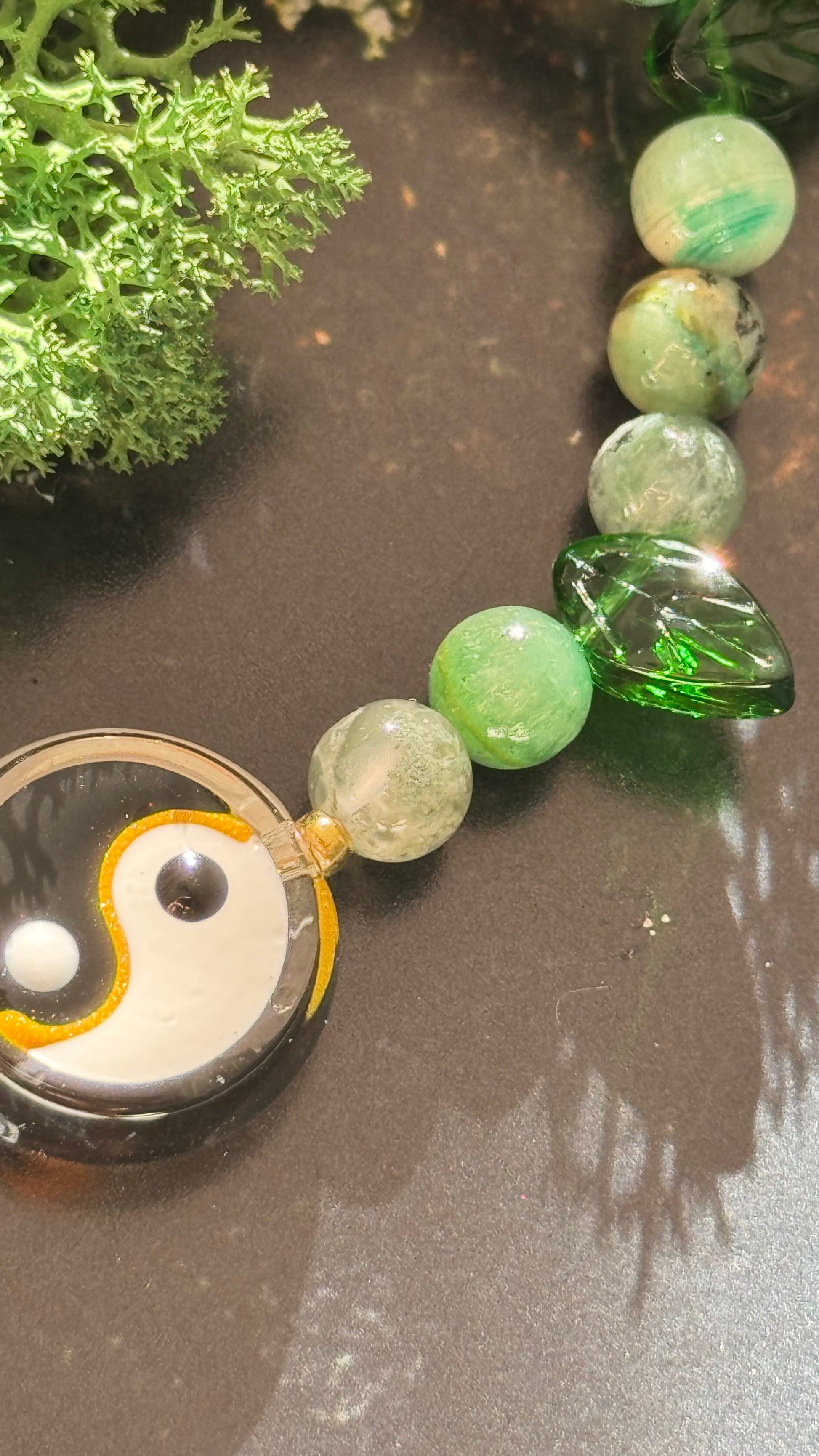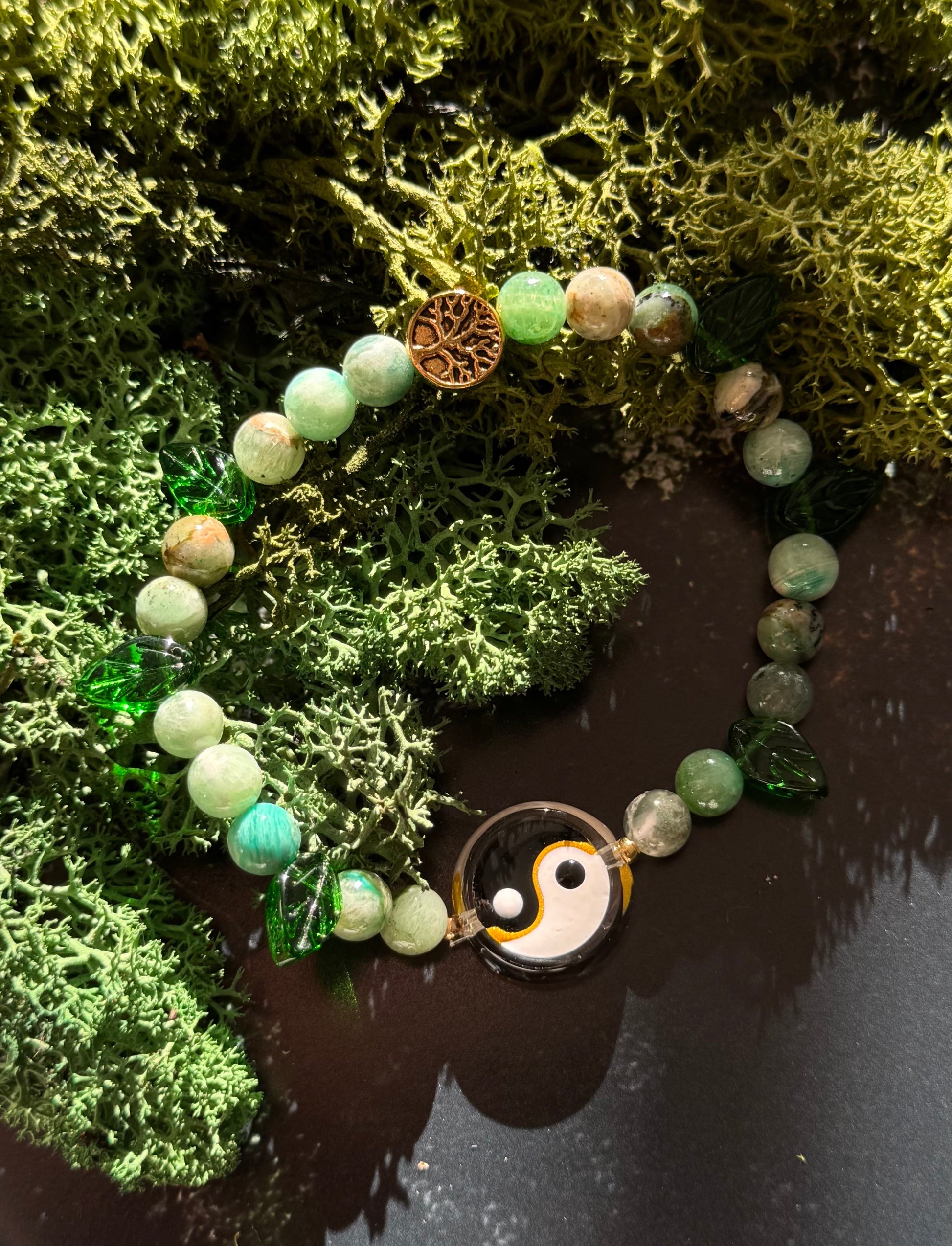 Schönes handgefertigtes Armband vereint sanfte Natursteinperlen in Grün- und Erdtönen mit leuchtenden Glasblättern und dem Symbol des Lebensbaumes. Die grünen Steine stehen für Harmonie, Wachstum und innere Ruhe, während die hellen, erdigen Perlen Stabilität und Ausgeglichenheit schenken. Der Lebensbaum in der Mitte verbindet Himmel und Erde und erinnert an die Kraft der Natur, stets im Gleichgewicht zu bleiben.